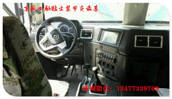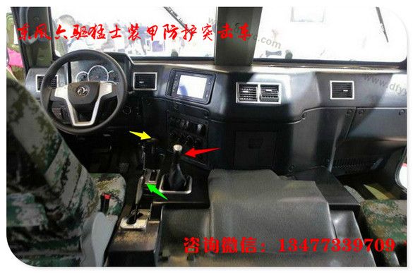 上圖是6輪驅(qū)動長軸2代猛士裝甲車駕駛艙特寫。較1代猛士裝甲車有24處改進。諸如:粗握把3幅面方向盤可以減緩駕駛員操作時的疲勞程度(1代猛士的方向盤為細握把,駕駛時間超過2小時手掌酸痛)。全新的組合儀表,將發(fā)動機轉(zhuǎn)速、車速、發(fā)動機水溫、機油壓力、蓄電池電壓顯示的更加清晰。各個功能按鍵全部改為由上至下按壓式大尺寸開關。而輪胎壓力調(diào)節(jié)開關從儀表臺左下側(cè)轉(zhuǎn)移至右側(cè)(此處改進有助于駕駛員快速操控)。