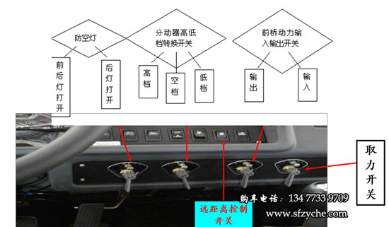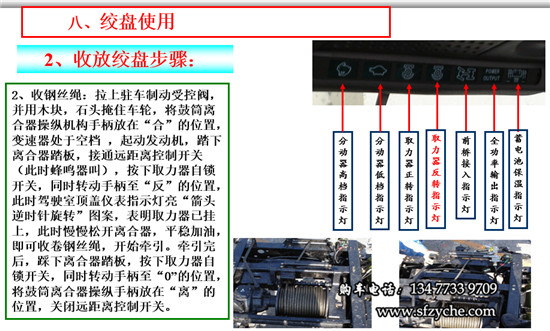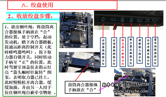 2、收鋼絲繩:拉上駐車制動受控閥,并用木塊,石頭掩住車輪,將鼓筒離合器操縱機構手柄放在“合”的位置,變速器處于空檔 ,起動發(fā)動機,踏下離合器踏板,接通遠距離控制開關(此時蜂鳴器叫),按下取力器自鎖開關,同時轉動手柄至“反”的位置,此時駕駛室頂蓋儀表指示燈亮“箭頭逆時針旋轉”圖案,表明取力器已掛上,此時慢慢松開離合器,平穩(wěn)加油,即可收卷鋼絲繩,開始牽引。牽引完后,踩下離合器踏板,按下取力器自鎖開關,同時轉動手柄至“0”的位置,將鼓筒離合器操縱手柄放在“離”的位置,關閉遠距離控制開關。