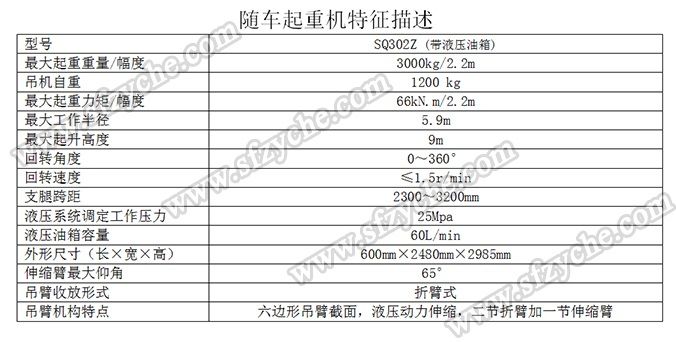 凈功率206kw; 起重機(jī)型號為:SQ302Z(帶液壓油箱),起重機(jī)質(zhì)量為:1200kg,最大額定超升載荷為:3000kg. 側(cè)防護(hù)金屬材料Q235斷面槽形,螺栓連接,斷面高度40mm,離地高度450mm; 后防護(hù)金屬材料Q235斷面槽形,螺栓連接,斷面高度135mm,離地高度500mm; 安裝具有衛(wèi)星定位功能行駛記錄儀,東風(fēng)越野隨車吊:www.jx-9.com 吊機(jī)詳細(xì)參數(shù):