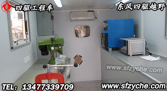 廂體頂部封閉,不可開啟。可配裝功率相當(dāng)、其他型號的發(fā)電機(jī)組。駕駛室前方安裝電動絞盤、廂體前部安裝備胎和可升降照明裝置、廂體內(nèi)部安裝有發(fā)電機(jī)組、電焊機(jī)、線纜盤、臺虎鉗、切割機(jī)、工作臺等維修工具。側(cè)防護(hù)、后防護(hù)與車輛均采用焊接連接,材料均為:Q235,后防護(hù)斷面尺寸(mm):100×60, 離地高度:500 mm.