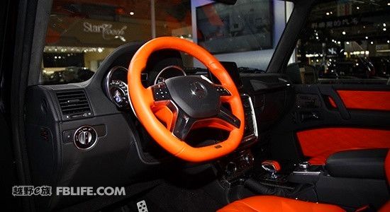 北京車展上的基于G63 AMG 6×6改裝而來的BRABUS 版700G 6 X 6 內(nèi)飾方面,該車采用了黑色和橘黃色的顏色搭配,強(qiáng)烈的顏色反差構(gòu)造出不錯的視覺效果。四幅式真皮方向盤外圈也采用橘黃色真皮包裹,搭配顏色裝飾條,視覺效果極佳。擋把的設(shè)計類似于飛機(jī)操作感,上面印有巴博斯的標(biāo)志,非常具有設(shè)計感。